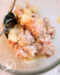 Add the 500g of sausage meat into a bowl with the 200g apple sauce. Mix together. (add the flour is the mix is too runny.)