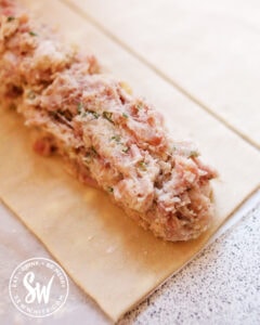 - Divide the mixture into 3 long sausage shapes and place each in the middle of the pastry rectangles.